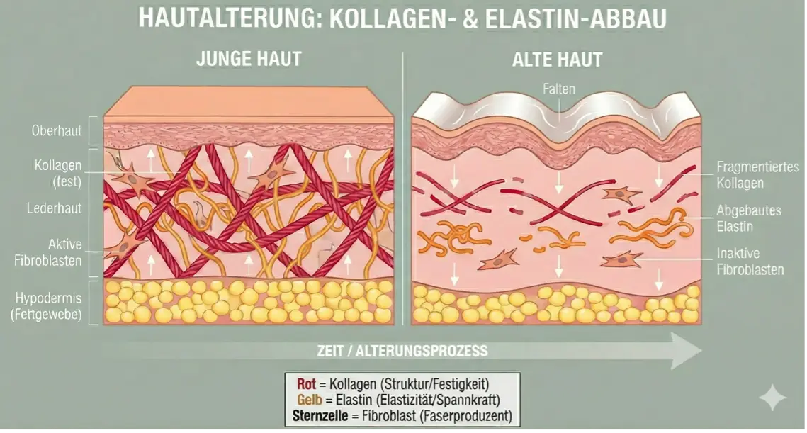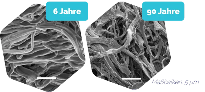 Unser körpereigenes Elastin wird durch äußere Faktoren (z.B. UV-Strahlung, Hautverletzungen) oder inneren Faktoren (z.B. oxidativer Stress, natürliche Hautalterung) irreparabel geschädigt. Dadurch nimmt die Elastizität unserer Haut stetig ab und es kommt unter anderem zur Faltenbildung. In der Abbildung siehst du den Vergleich von elastischen Fasern im Laufe der Zeit. Die ursprünglichen glatten elastischen Fasern sind im hohen Alter rau und beschädigt.